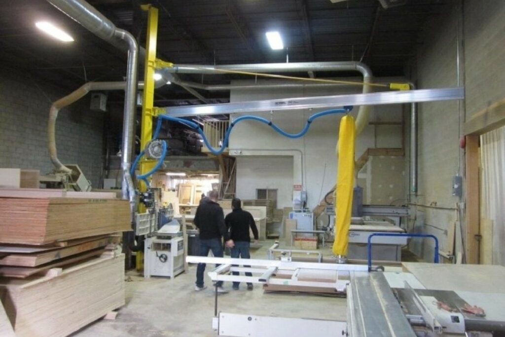 This carpentry company required a safe and efficient way to move large wood and MDF sheets throughout their workshop without damaging the material or overexerting workers. The vacuum end effector allows operators to handle large sheets safely and efficiently.